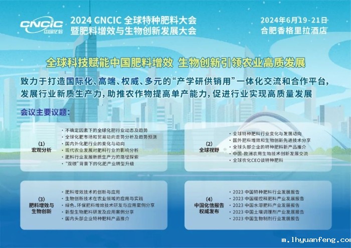 经过多年的发展,我国已经成为了特种肥料生产大国,具备缓控释肥、水溶肥料、微生物肥料等成熟产品体系,并拥有一批忠诚客户,但是整体来看,行业仍然呈现出大而不强、多而不优等问题。为借鉴全球特种肥料行业前沿技术和先进模式、研讨中国肥料增效与生物创新存在的共性问题,发展新质生产力,催生新模式、新动能,推动行业向高端化、智能化、绿色化转型,中国化工信息中心定于2024年6月19-21日在安徽省合肥市香格里拉酒店举办“2024 CNCIC全球特种肥料大会暨肥料增效与生物创新发展大会”。